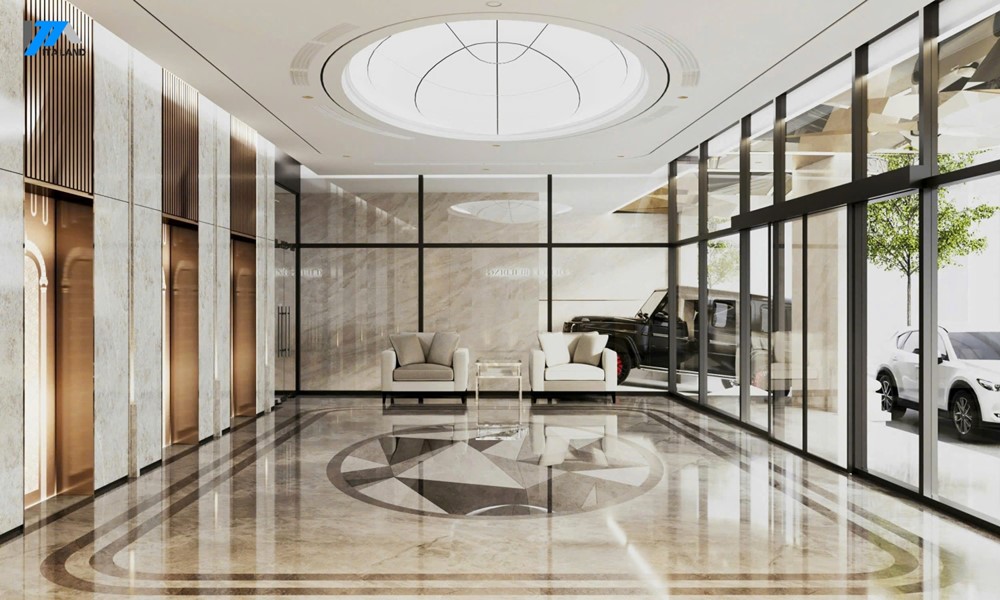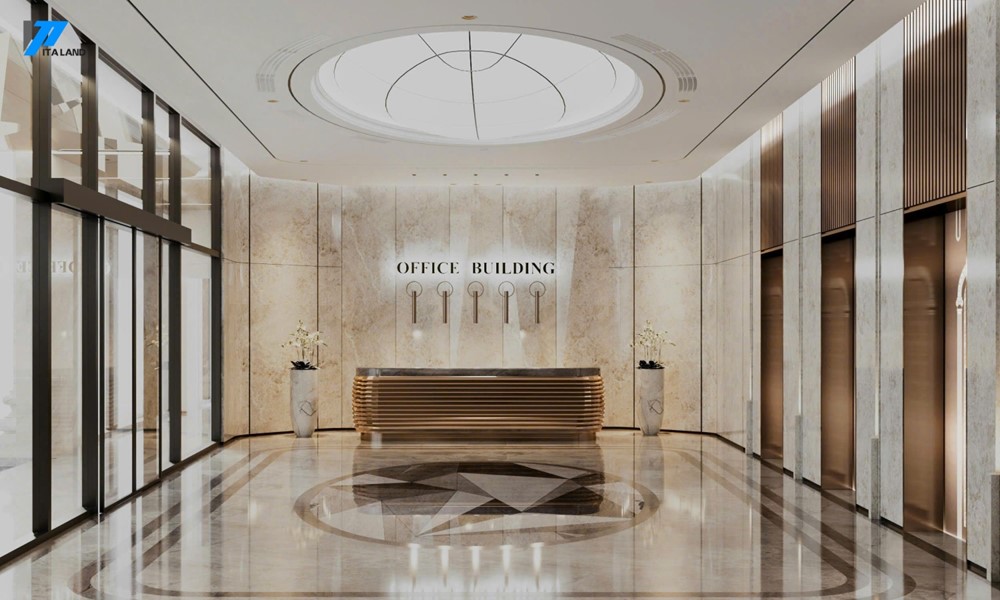 Thiết kế tổng thể hiện đại, sử dụng vật liệu cao cấp, trần cao thông thoáng, mang đến không gian làm việc và kinh doanh chất lượng.