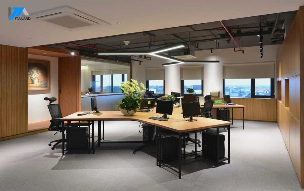 Hệ thống chiếu sáng hiện đại, tiết kiệm năng lượng nhưng đảm bảo ánh sáng đầy đủ cho không gian làm việc.