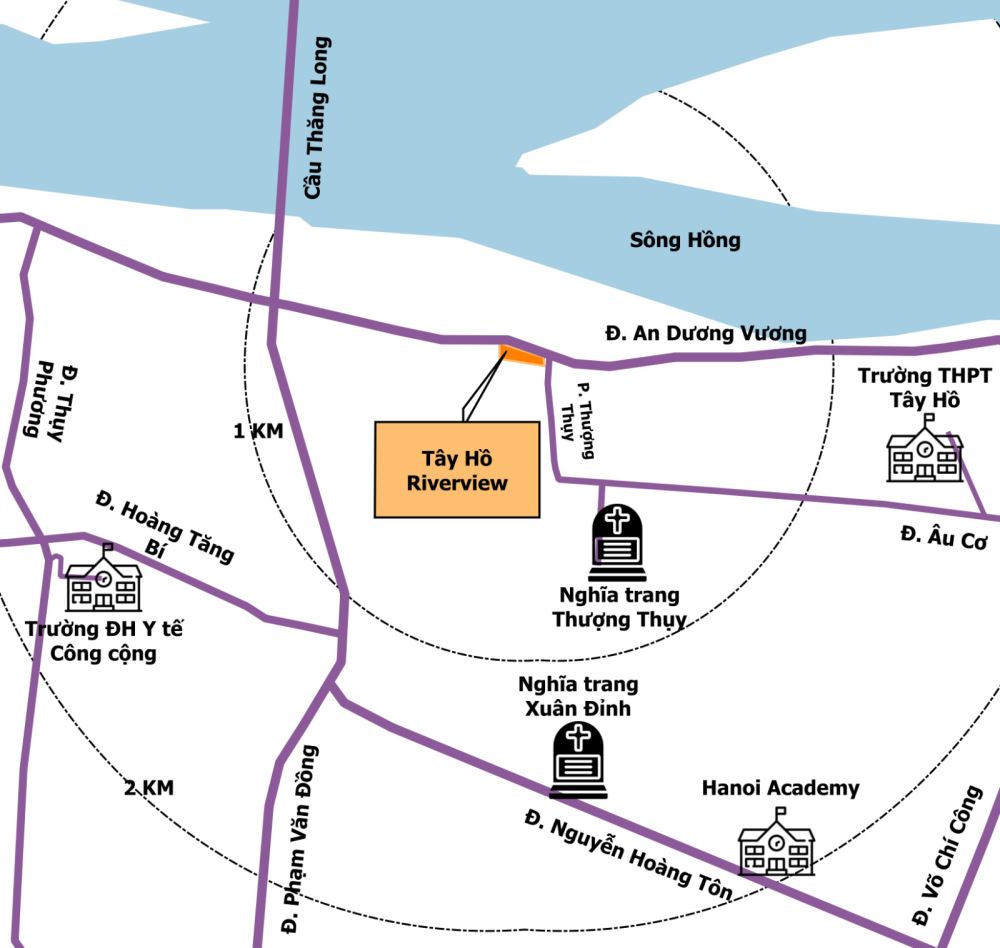 Tây Hồ River View còn nằm cạnh nhiều tòa nhà văn phòng nổi bật như Veam Phú Thượng, Ecolife Tây Hồ, 6th Element, IDMC Tây Hồ, tạo thành một khu vực sầm uất và chuyên nghiệp.