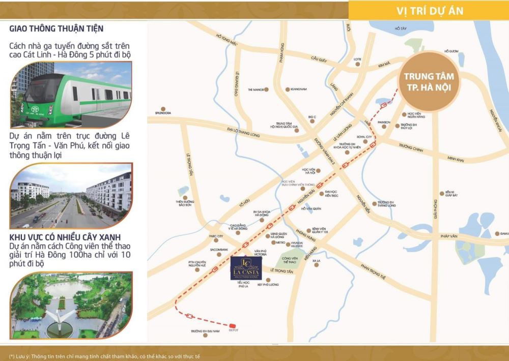 La Casta Văn Phú chỉ cách trung tâm Hà Nội khoảng 12 phút di chuyển theo hướng Tây Nam, kết nối dễ dàng qua các tuyến đường Chu Văn An – Tây Sơn – Nguyễn Trãi – Quang Trung.